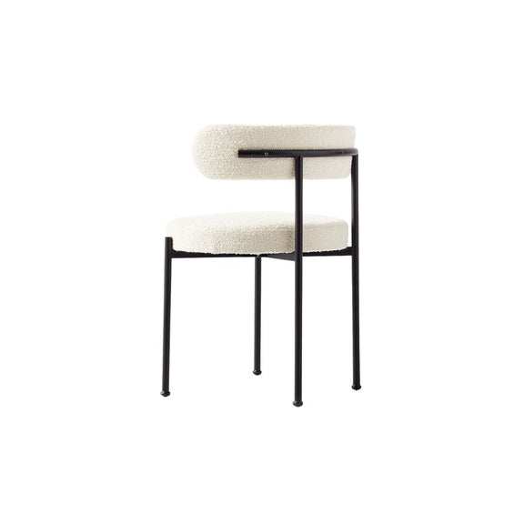 Steel tube with matte black finish frames a modern, Italian-made dining chair. Textural ivory boucle wraps the curved back and round seat in luxe contrast.